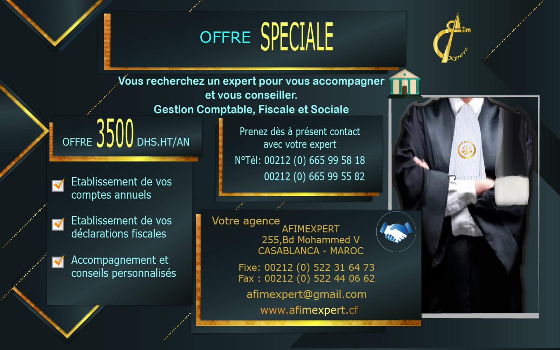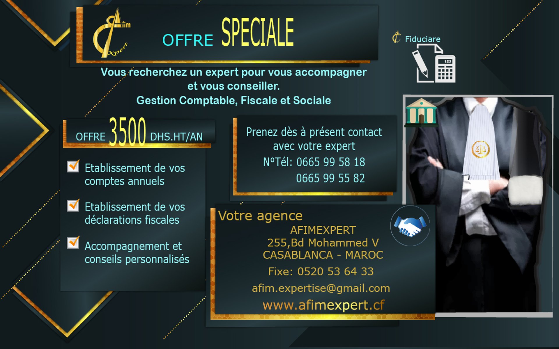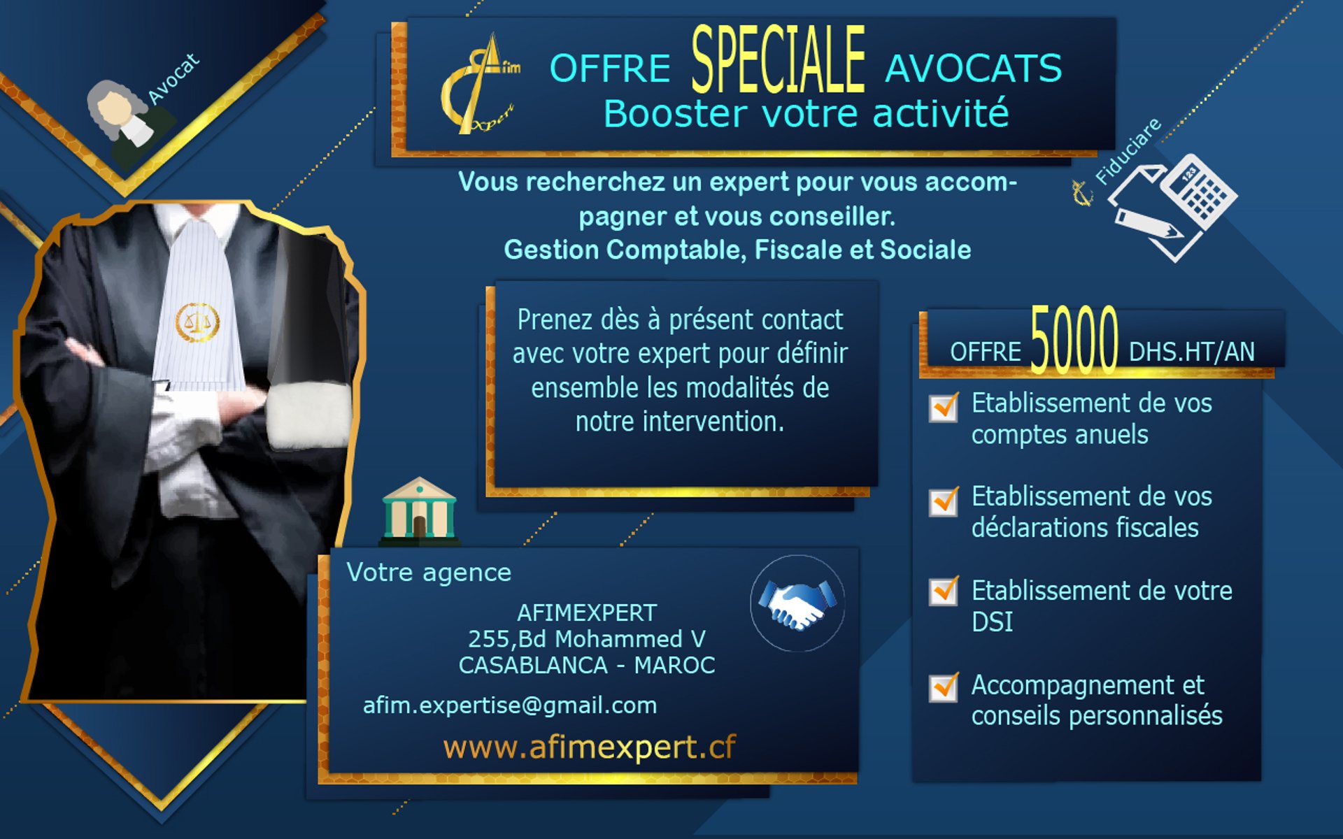 AfimExpert, à Mohammed V à Casablanca, est un cabinet d'experts-comptables offrant des services professionnels et des conseils pour tous vos besoins comptables. Nous sommes fiers de fournir des solutions à la hauteur de vos attentes.